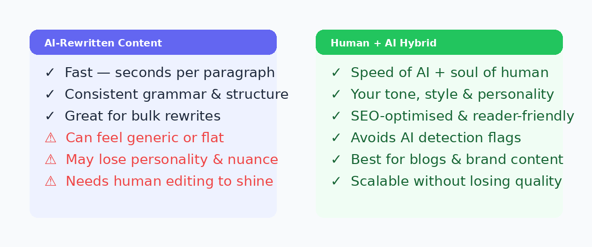 AI rewriting tools are extraordinary at handling the mechanical side of content: restructuring arguments, varying sentence length, correcting grammar, and hitting SEO targets. But they cannot manufacture experience, inject earned credibility, or replicate the specific way you see the world.